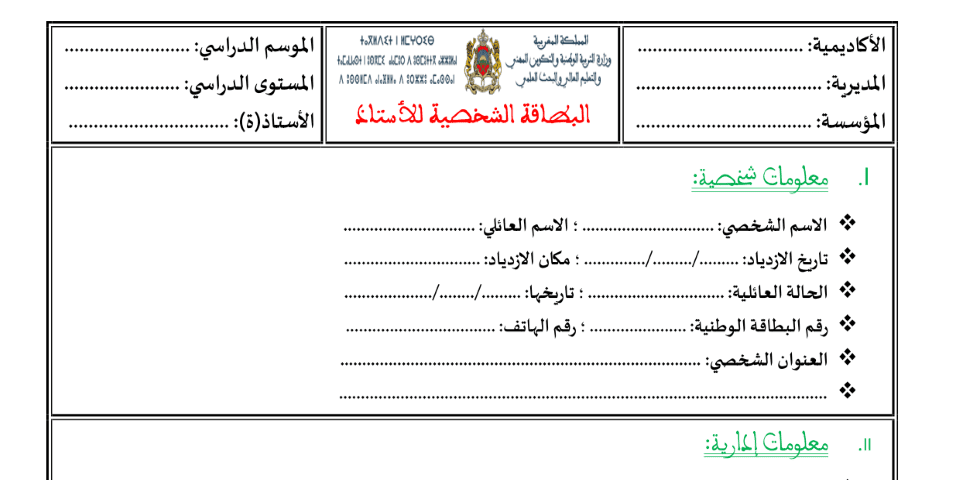 البطاقة الشخصية للأستاذ فرنسية و عربية